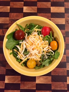 I made an arugula and baby spinach salad with gourmet tomatoes and Colby Jack cheese. I added sliced fungus (not pictured) on my hunka hunka’s salad.