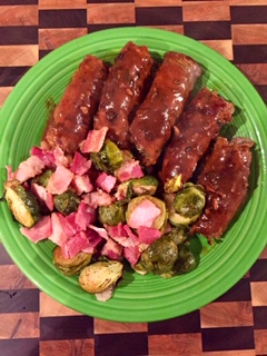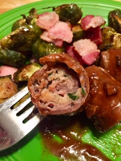 I paired the beef braciole with roasted Brussels sprouts and bacon.  The dish was tasty enough to stand alone, but I wanted to add a veggie in there for color and for health’s sake.  Oddly enough I have taken quite a liking to Brussels sprouts.  I discovered them this past year and can actually eat a whole batch of roasted ones all by myself.  Go figure.  Moma would be so proud!  Or shocked!  Probably a little of both.