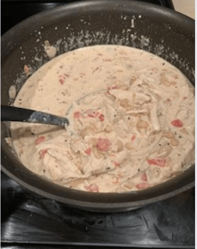 2. Boil chicken until no longer pink, remove from broth, let sit for a few minutes to cool down, shred chicken.