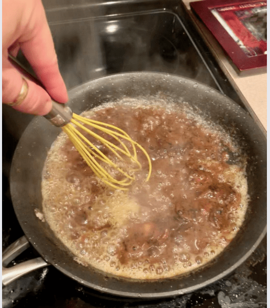 Once mushrooms are brown, add minced garlic and a dab of Dijon mustard. Blend well. Add 2 tablespoons of flour to create the roux. Once the flour is well-blended, add beef broth while whisking at same time.