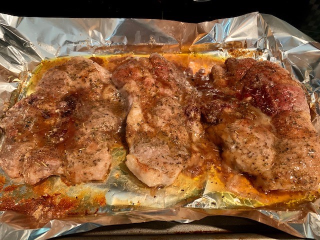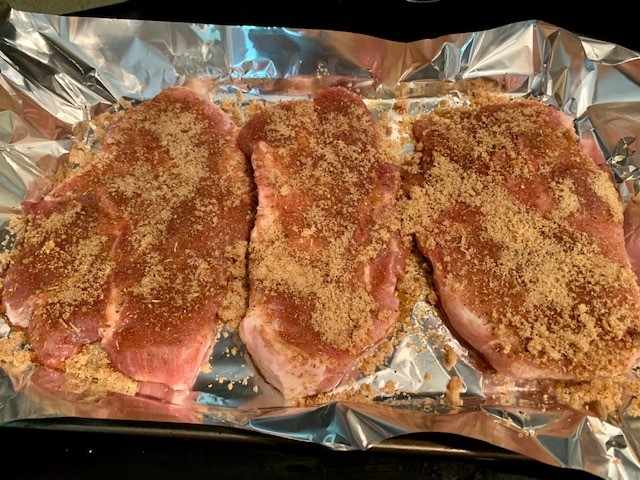 Preheat oven to 375. Line a cookie sheet with aluminum foil. I love aluminum foil. It saves me from so much clean up after a meal. Pat dry your pork chops. Drizzle olive on both sides of the chops. Generously apply your rub on both sides of the chops.