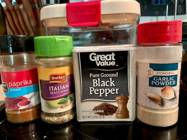 I make my dry rub ahead of time: 2-3 tbs. brown sugar, dash of paprika, Italian season, pepper and smidge of salt. I put all of this in a ziplock bag to blend. I don’t measure this. Add a little more, or less, of the spices you like. NOTE: I like to have enough of the dry rub to cover the amount of pork chops I’m cooking.