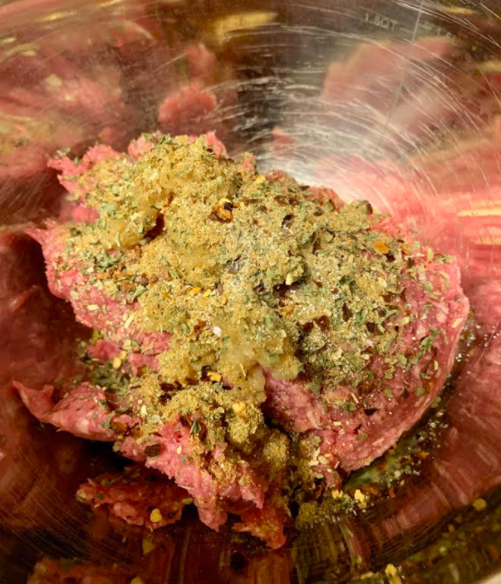 One lightly beaten egg was the binder. Along with the egg, you need a pound of ground lamb, three gloves of minced garlic, salt and pepper, parsley, cumin, oregano and red pepper flakes. I like a little kick so I probably added a full tablespoon of the red pepper flakes. Again…I don’t measure. I just eyeball.
