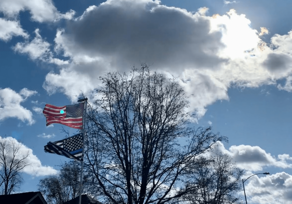 I kept pushing through the pain. Mind over matter. I didn’t want to walk for fear of the pain being worse. Instead of running my normal three miles, I cut the route shorter as I didn’t want to be too far from home. I captured a beautiful picture of the wind blowing the American flag and thin blue line flag. If you look, there’s an orb on the American flag. I wonder whose spirit is shining through.