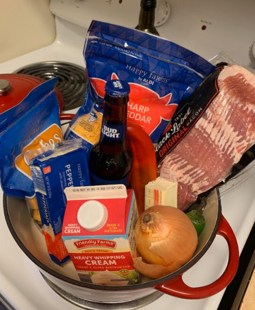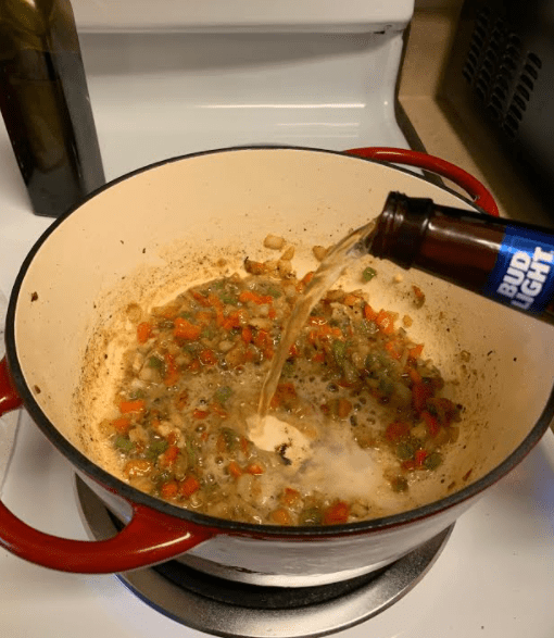 Cook the bacon. Remove the pieces to soak on a paper towel, as well as dispose of most of the grease from the pot. Add the veggies in to cook until tender. Then add 4 tbs. butter. Once that is melted, add flour to incorporate and then add that tasty bottle of beer. Of course I add my personal favorite, Bud Light.