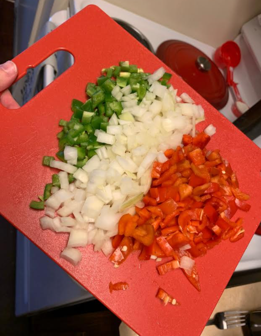 Use a half pound bacon and cut into pieces. The recipe calls for 1/2 inch pieces, but it is entirely up to you. I like to chop all of my veggies ahead of time. When you are cooking with stuff on the stove, any second matters on preventing burning. The recipe said to finely chop the veggies, but I’m more of a dice person. I like to taste my veggies. I used one medium onion, one red bell pepper, and one jalapeno – with the seeds removed. I knew I was sharing this soup, but wasn’t sure of the heat tolerance of others. My veggies were Christmasy (or Italian flagish) haha!