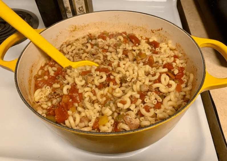 I hope you enjoyed my way of American Chop Suey. Beyond tasty. It’s like a chili mac with bacon! My new Le Creuset dish cleaned up nicely. I can’t wait to use again. This is the wide Dutch oven. I have my eye on the round Dutch oven, maybe next Christmas. That will take cooking to a whole new level.