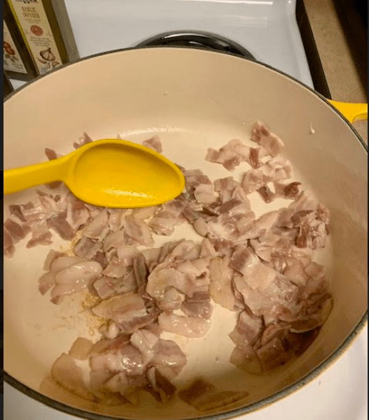 Get a pot of water boiling. You will need this cook macaroni, or pasta of your choice. I cut the bacon in one inch pieces and cooked that about halfway through. You do not want to have crispy bacon or it will not make this a smooth eating dish. Look how pretty bacon looks cooking in my new dish…and do you see my matching silicone utensil. Priorities, ya know?!