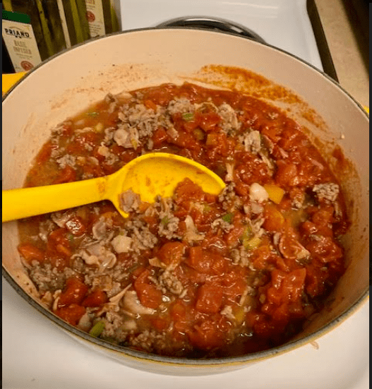 So far I have been following Alma’s recipe, but here’s where I change it up. Alma says to use three cans of whole tomatoes and then crush them in pan. Huh?! Alma – they sell cans of crushed tomatoes…hello! But I also wanted to add a little kick. Instead of all the tomatoes, I use two cans of diced tomatoes and green chilies (Rotel). I love Rotel! I also added two cans of crushed tomatoes into the pot. The picture is to die for!