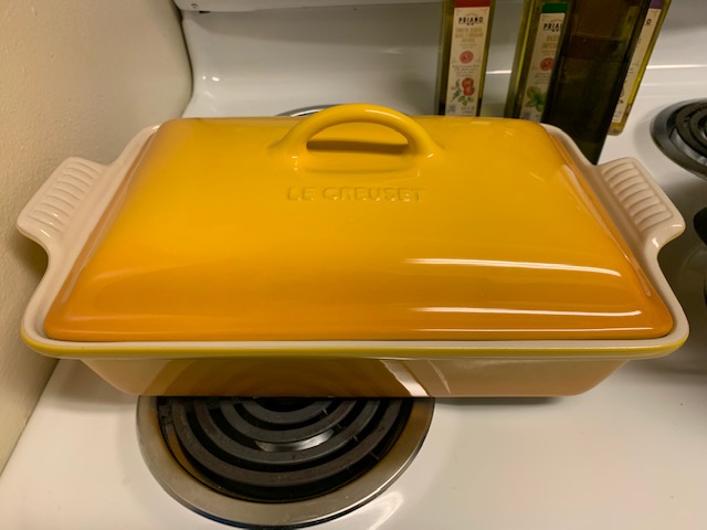 Mix that well and then add a tub of French onion dip. Stir until blended and add cooked egg noodles. Pour into your prepared casserole dish. I’m excited to use my new Le Creuset casserole dish my dad got me for Christmas. Sara is very envious of this piece. It’s not just versatile going from oven to tabletop, it’s gorgeous! Matches my Dutch oven I got for Christmas.