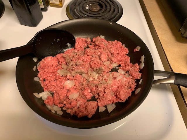 Preheat oven to 350. Prepare a 9×13 oven safe dish. Cook 10-12 ounces of egg noodles according to package, drain, and set aside. While the oven is warming up, sauté chopped onions and brown one pound of ground beef.