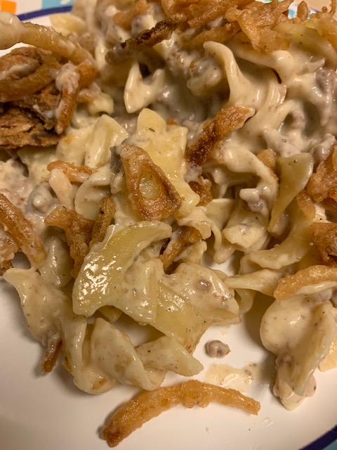 Sprinkle top with French’s fried onions. (I can eat those straight out of the can) I used the entire can to cover it…you may be able to use less. But I love those things. Bake for 25-30 min, until bubbly hot.