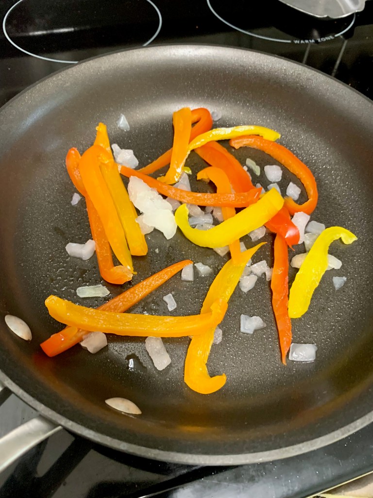 I started off sautéing 1/4 of two different bell peppers and chopped onion with olive oil in a skillet.