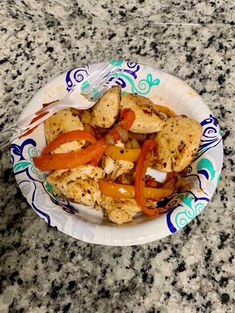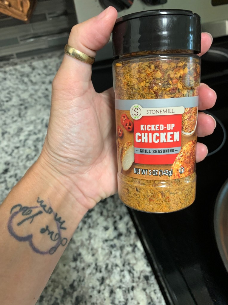 I misjudged how much meat was in one package. For me there was enough for three servings. I pulled out enough that seemed to equate to one chicken booby. I patted it dry and set it on a paper plate. I found a little tasty magic in some random seasoning from Aldi’s. I went ahead and seasoned one side with this yummy goodness. And then waited while the peppers and onions cooked down enough to my liking.